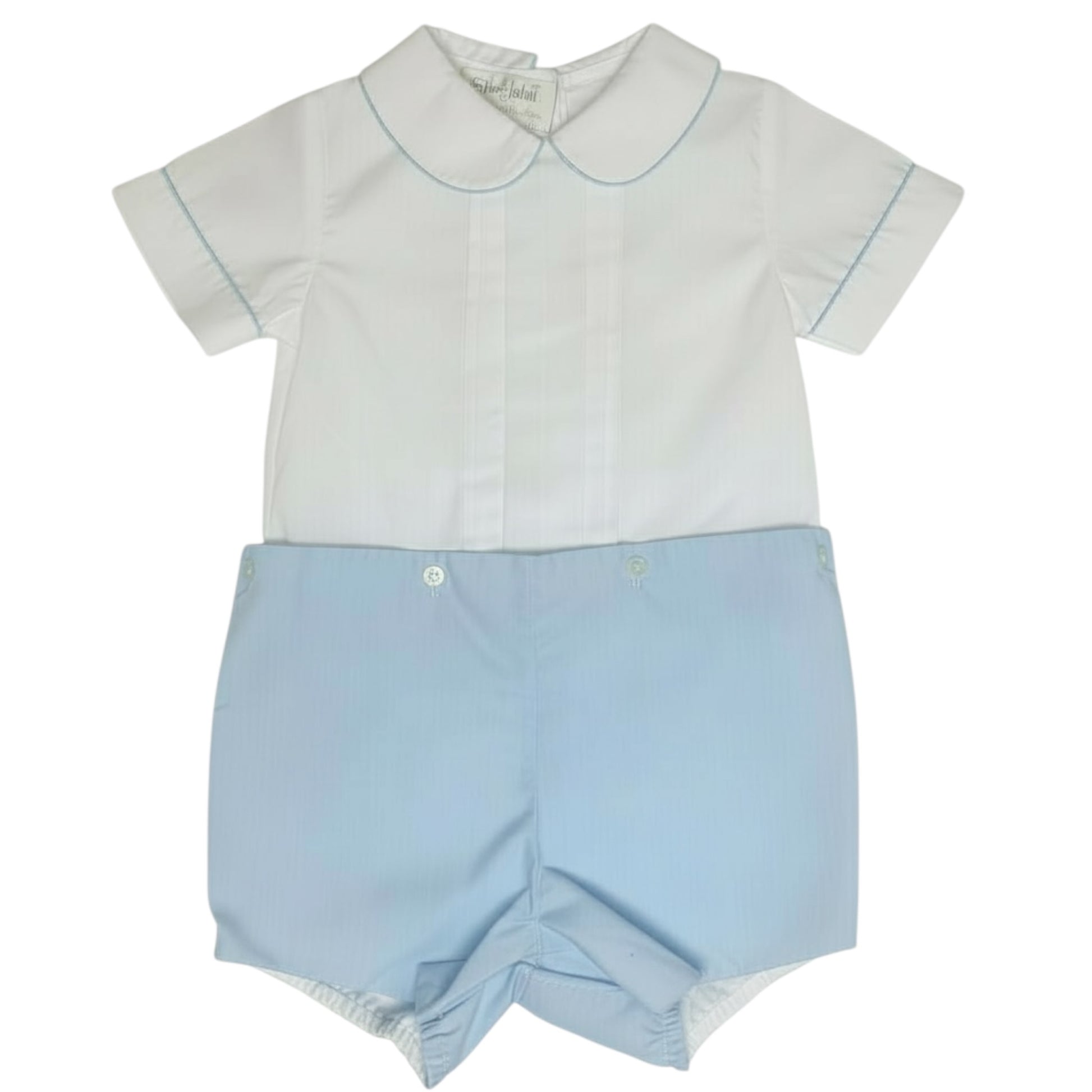 A timeless classic designed with sweet, traditional charm. This white and blue button-on short set features a crisp white top accented with a classic Peter Pan collar, paired with coordinating blue button-on shorts for a polished, heirloom-inspired look.